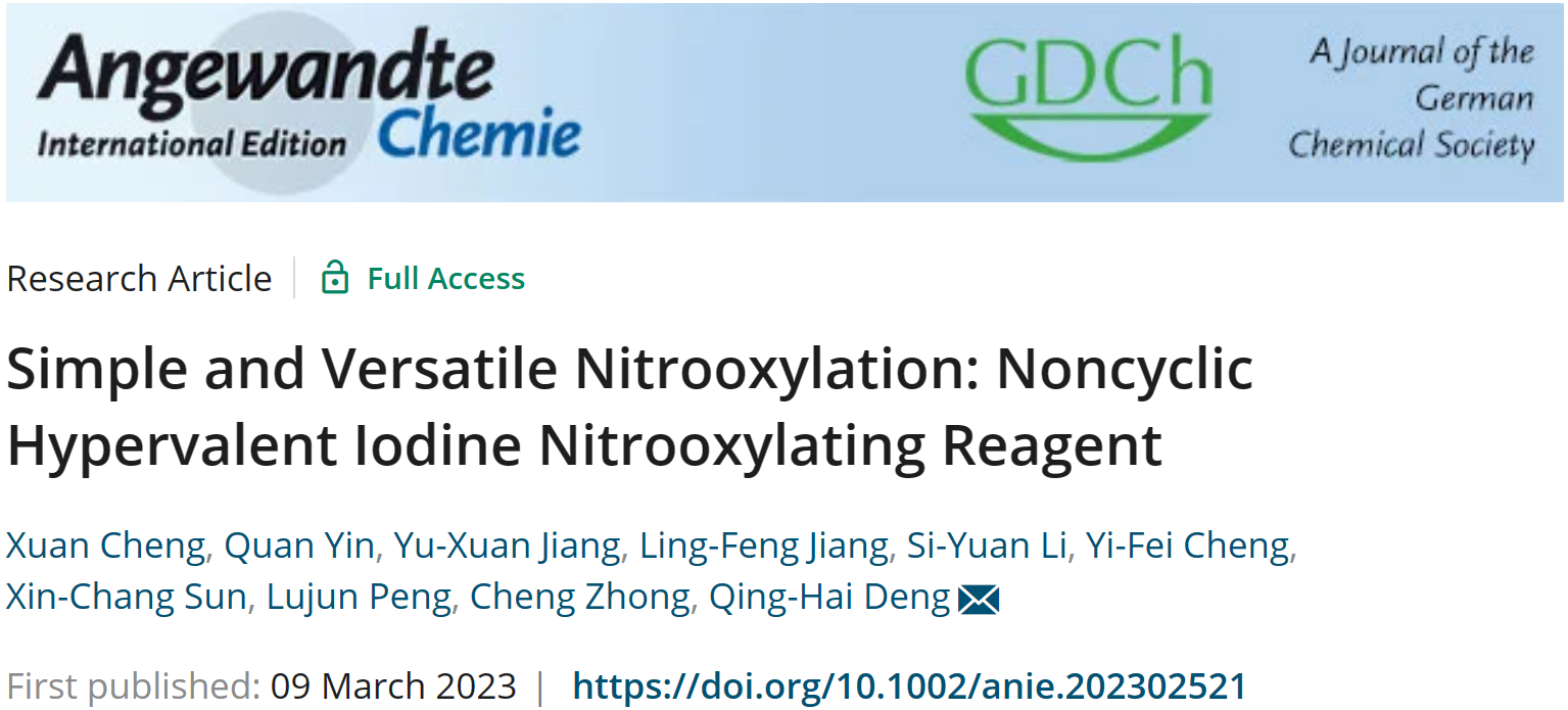近日,米粒av 邓清海教授团队在Angewandte Chemie International Edition (IF = 16.8)上发表论文“Simple and Versatile Nitrooxylation: Noncyclic Hypervalent Iodine Nitrooxylating Reagent”,发展了一类新型非环高碘硝酸酯化试剂,为硝酸酯的安全、绿色、高效制备提供了新方法。上海师范大学为唯一通讯单位,我校2021级博士生成轩为第一作者,邓清海教授为论文通讯作者。