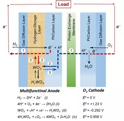 团队在之前的研究中,已成功制备了一种六方晶系WO3电容材料,该材料被证明在HOR/HER反应电位范围内具有质子储放能力。此次,论文作者创造性地将WO3与PEMFC器件有机的结合在一起,缓解了PEMFC在实际使用过程中发生的性能衰减。