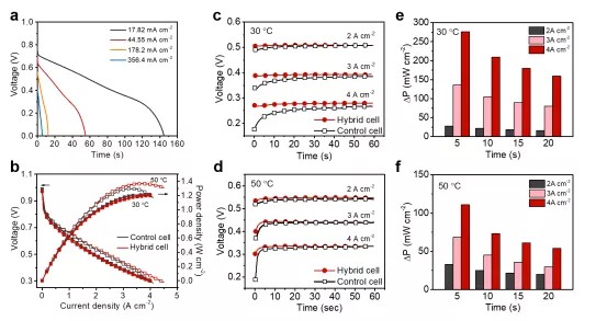▲图3:复合电极的放电特性和电池的瞬态性能。(a)在空气电容器结构中测量不同电流密度下WO3电极的恒电流放电曲线。(b)复合电池(有WO3)和对照电池(无WO3)在30℃下的极化曲线和功率密度。将100%湿度的H2(化学计量数= 1.5)和O2(化学计量数= 4)分别通入阳极和阴极。复合电池和对照电池在30°C/50°C从低电流输出(0.05A cm-2)瞬时切换到其他不同电流输出时(c, d)电压和(e, f)平均△P随时间的变化值。