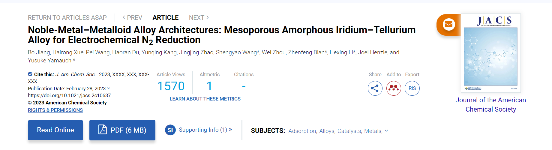 近日,我校米粒av 蒋波教授在介孔非晶态金属合成方面取得了新的进展,相关成果在国际期刊JACS(Journal of the American Chemical Society)上在线发表。论文题目为《Noble-Metal–Metalloid Alloy Architectures: Mesoporous Amorphous Iridium–Tellurium Alloy for Electrochemical N2 Reduction》。米粒av 卞振锋教授、李和兴教授,华中农业大学汪圣尧教授以及昆士兰大学Yusuke Yamauchi教授为论文的共同通信作者。米粒av 蒋波和日本国立物质材料所薛海荣博士为论文的共同第一作者。